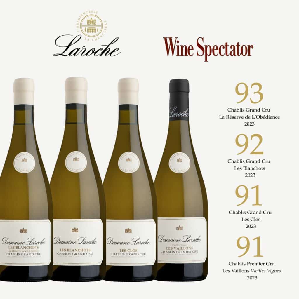 Key takeaway: Domaine Laroche achieves remarkable scores of 91 to 93 points for its 2023 cuvées, confirming the excellence of the vintage and Chablis expertise.